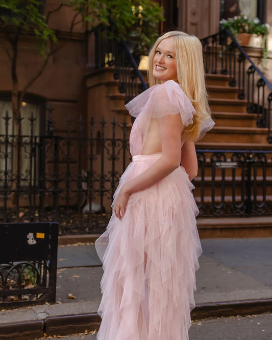 V Neck Tulle A Line Prom Dress Pleated Wedding Guest Dress J9348
