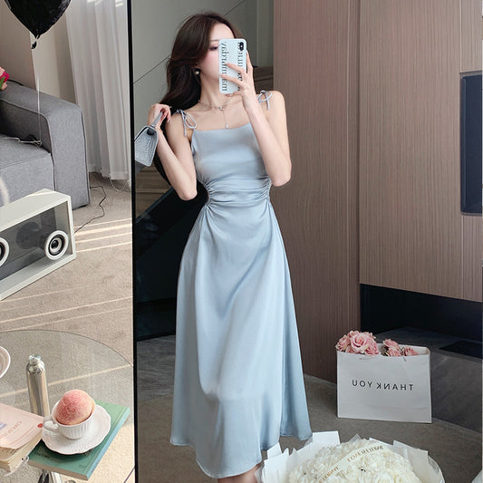 White Satin Spaghetti Strap Dress Mid Length Sheath Dress 61