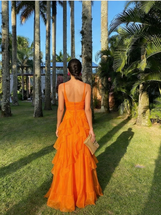 Ruffles Orange Long Prom Dresses V Neck Wedding Guest Dress 2195