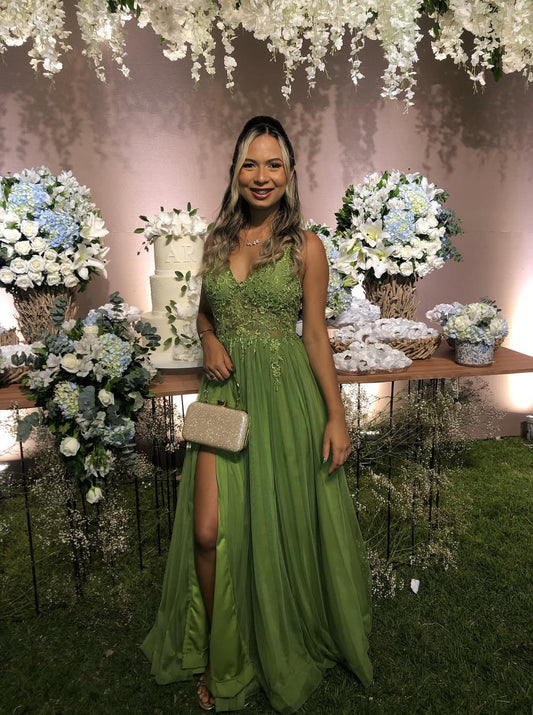 V Neck Tulle Green Long Prom Dress Slit Formal Party Dress J8892