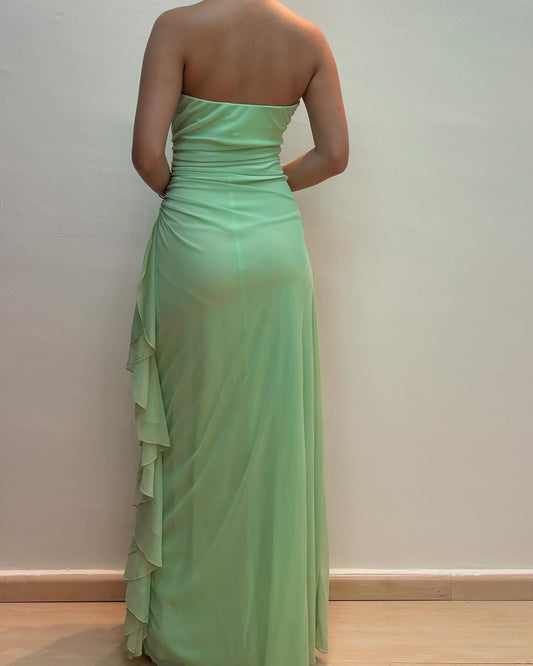 Strapless Green Sheath Ruffle Long Prom Dress J3134