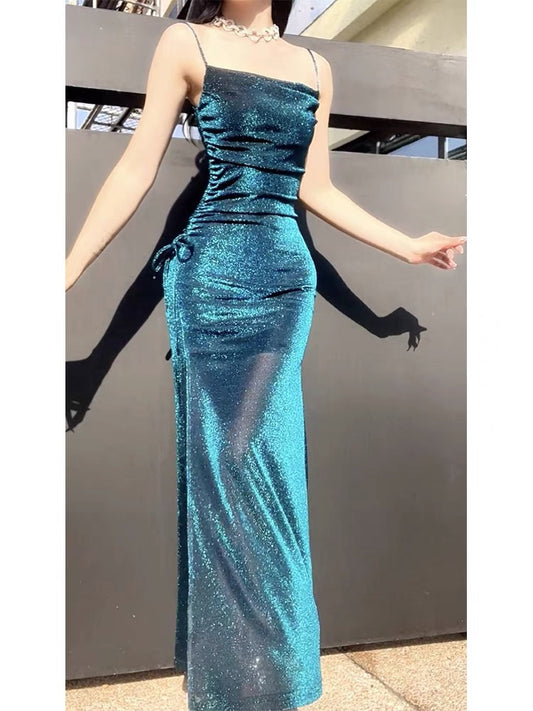 Blue Sheath Long Prom Dress Shiny Evening Dress J3196