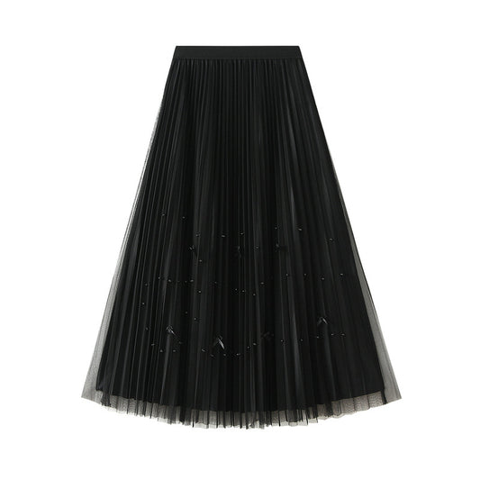 Mesh Skirt Beaded Bow Knot Pleated Long Skirt 755