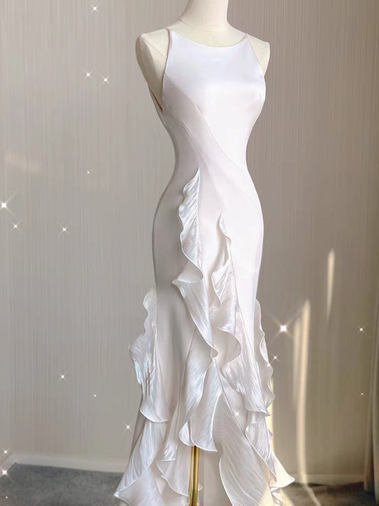 Mermaid Ruffle White Wedding Dress Long Prom Dress J3181