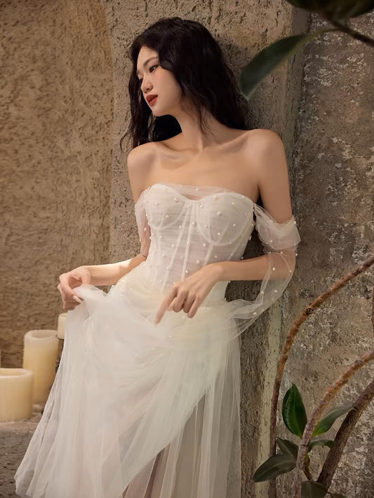 Off The Shoulder White Wedding Dress Beaded Long Prom Dress J3249