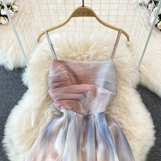 Thin Shoulder Strap Summer French Retro Smudge Printing A-line Dress 255