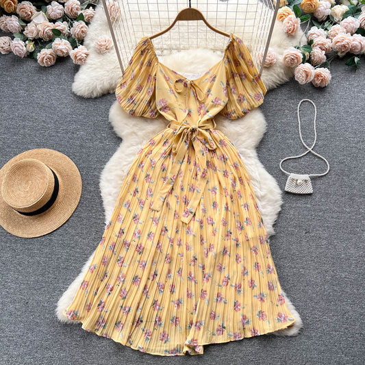 French Puff Sleeve Floral Dress Women's Summer Chiffon Long Dress 277