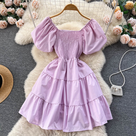 Summer Sweet Square Neck Bubble Short Sleeve Puff Dress Princess Skirt 239