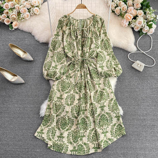 Round Neck Bubble Long-sleeved A-line Dress Women's French Gentle Style Green Floral Long Skirt 244