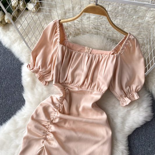 French Retro Chic Break Slit Puff Sleeve Dress for Women Summer 246