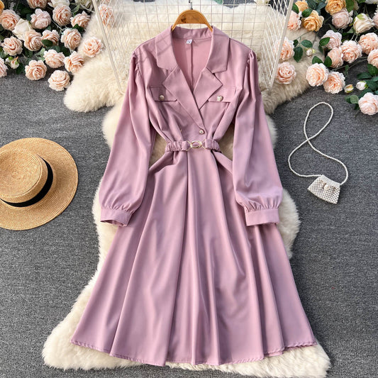 French Long Sleeve Mid Length Suit Collar Dress 247