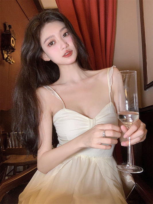 Gilt Yellow Dress Pressed Pleated Elastic Hip Sexy Backless Suspender Dress 234