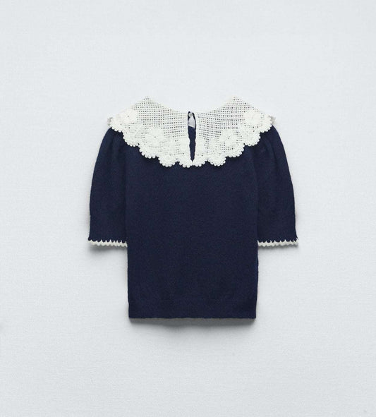 Summer Navy Sweet Bow Short Sleeves Round Neck Sweater Top 1484