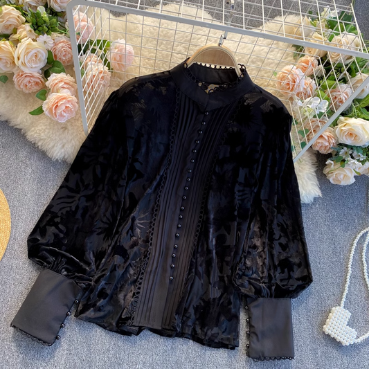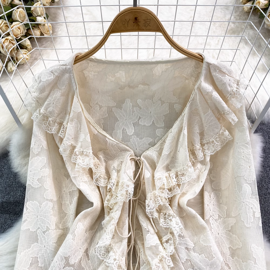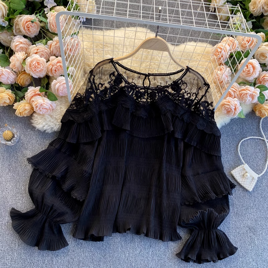 French See-through Mesh Lace Ruffled Puff Sleeve Chiffon Shirt 1868