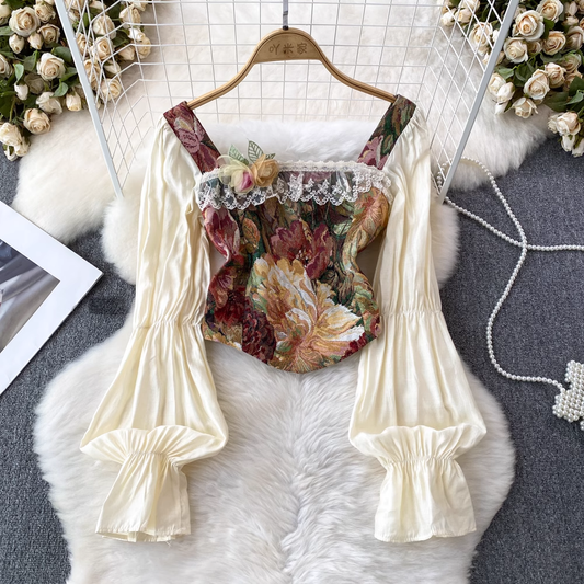 Spring and Autumn Retro Long Sleeve Square Collar Printed Shirt Women's Casual Top 1402
