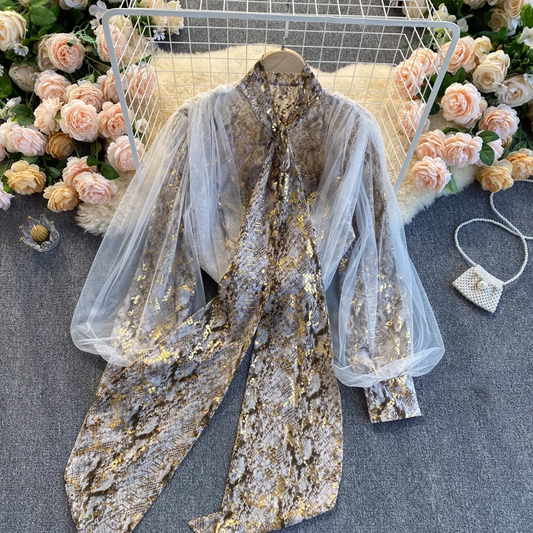 Mesh Lantern Sleeve Retro Snakeskin Pattern Shirt Women's Top 1867