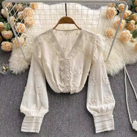 Sweet Embroidered Lace V-Neck French Style Shirt Top 1871