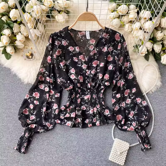 Chiffon Long-sleeved Shirt for Women Sweet V-neck Short Floral Top 1869