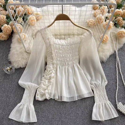 Chiffon Trumpet Sleeve Off shoulder Top Summer Women Pleated White Top 1052