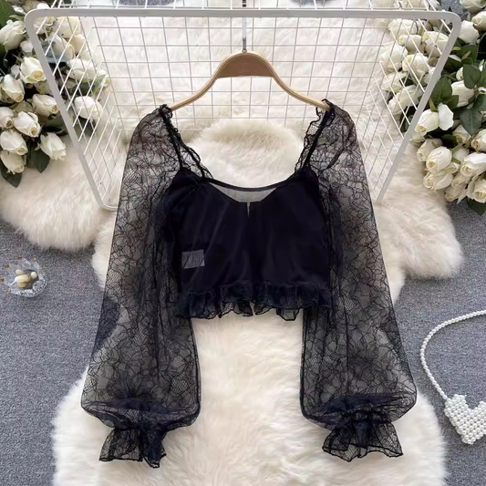 French Fairy Net Long Sleeve Printed Shirt Summer Cropped Top 1050