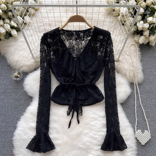 Hollow V-neck Lace Top Long Sleeves Summer Shirt 1056