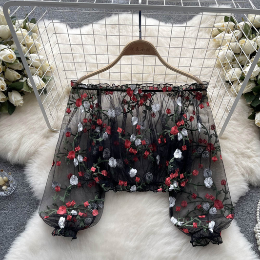 Retro Off Shoulder Mesh Embroidered Shirt Puff Sleeve Top 1064