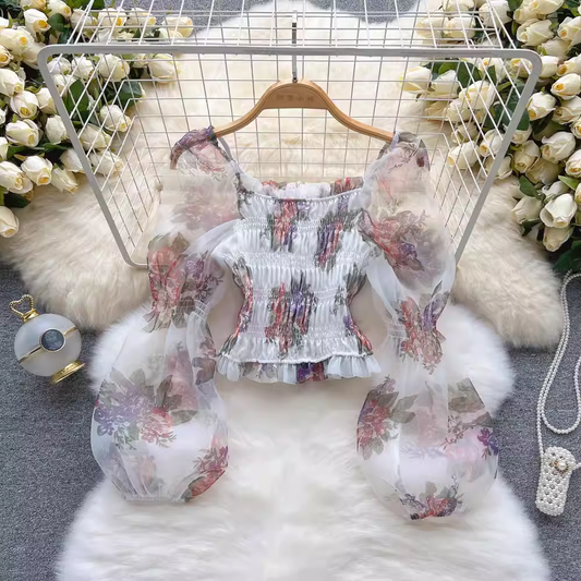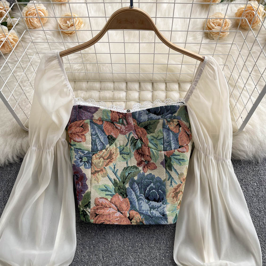 French Lantern Sleeve Floral Top Cropped Square Neck Shirt 1055