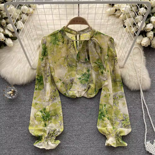 French Lantern Sleeve Chiffon Top Summer Print Cropped Shirt 1054