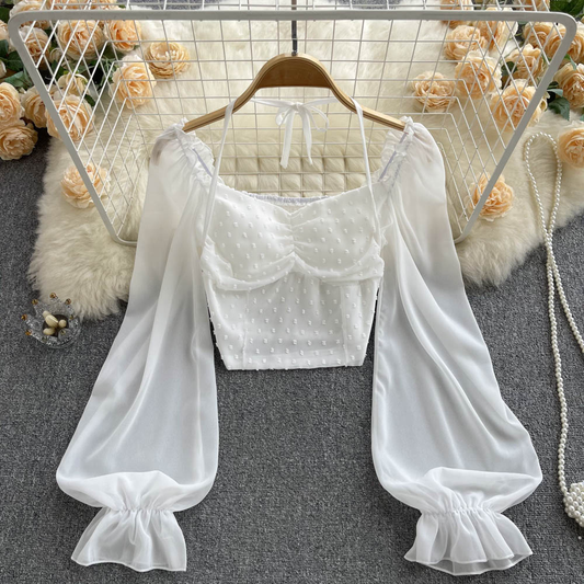 Polka Dot Pleated Balloon Sleeve Cropped Top 1053