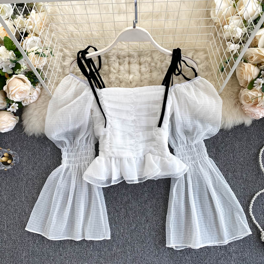Fairy Puff Sleeve Pleated Cropped Chiffon Top 1020