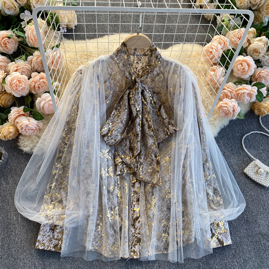 Ladies Mesh Balloon Sleeve Loose Retro Top 1026