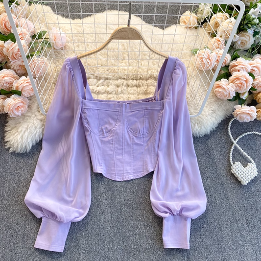 Chiffon Puff Sleeve Long Sleeve Top Square Neck Cropped French Shirt 1023