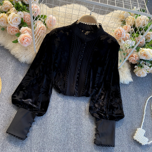 French Retro Mesh Lace Top Stand Collar Embroidered Puff Sleeve Shirt 832
