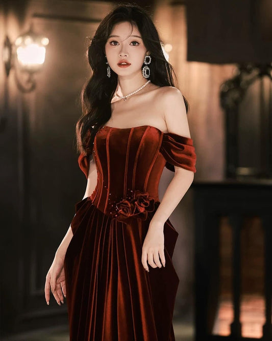 Schulterfreies A-Linien-Ballkleid aus Samt, lang, J3061