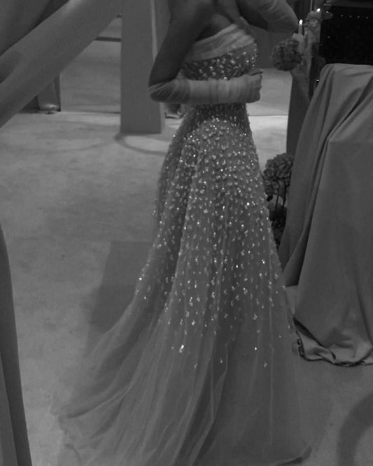 Trägerloses A-Linien-Ballkleid mit weißen Pailletten und langem Rock J3068