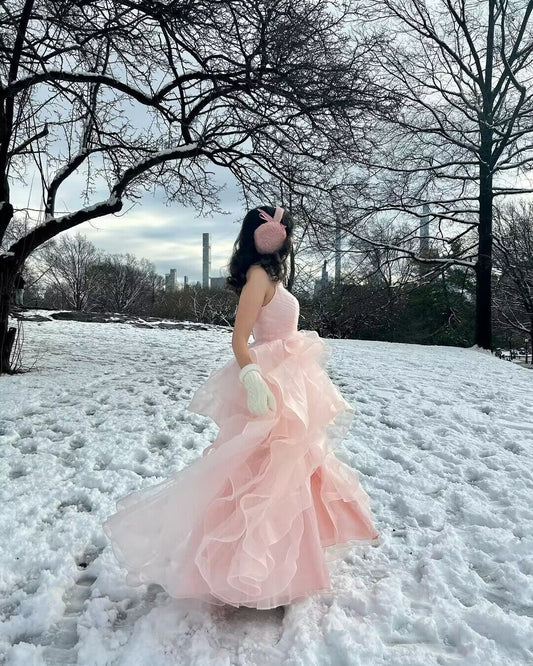Trägerloses, rosarotes, langes Ballkleid in A-Linie, mehrlagiges formelles Partykleid J2779