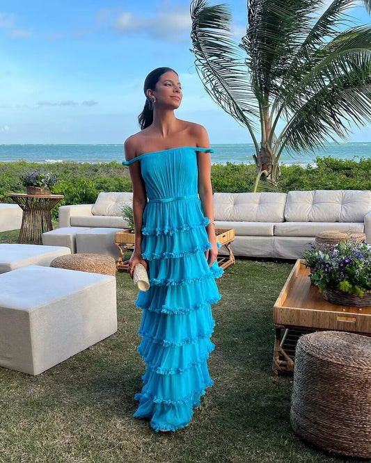 Schulterfreies, blaues, mehrlagiges Ballkleid in A-Linie, lang, J2774