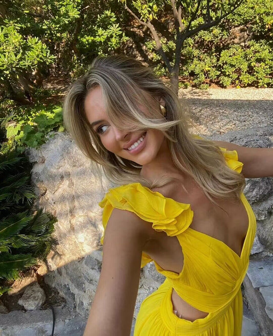 V-Ausschnitt Gelb A-Linie Langes Ballkleid Chiffon Formales Partykleid J2719
