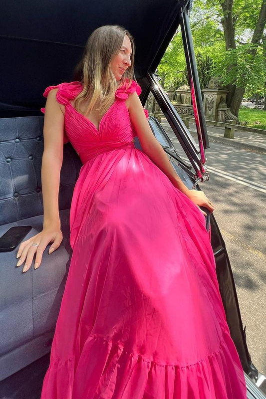 Rosarotes, langes Ballkleid mit Rüschen an der Schulter und V-Ausschnitt in A-Linie 2288