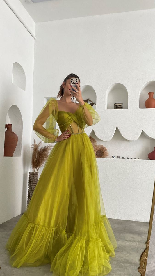 Grünes Tüll-Abschlussballkleid in A-Linie mit langen Ärmeln, formelles Partykleid 2189