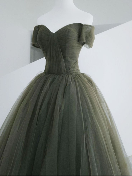 Schulterfreies grünes langes Ballkleid in A-Linie aus Tüll für Senioren 2133