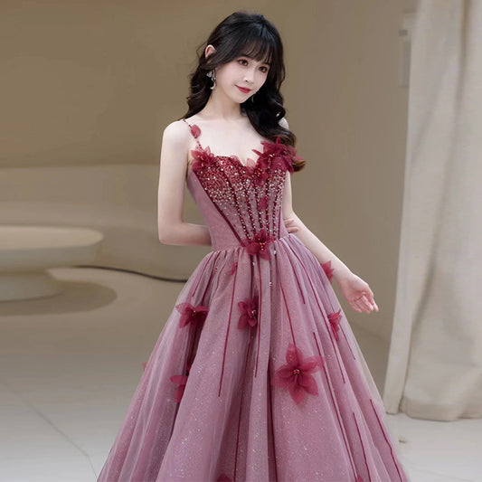 Spaghettiträger, heißes Rosa, langes Ballkleid, A-Linie, Seniorenkleid 2128