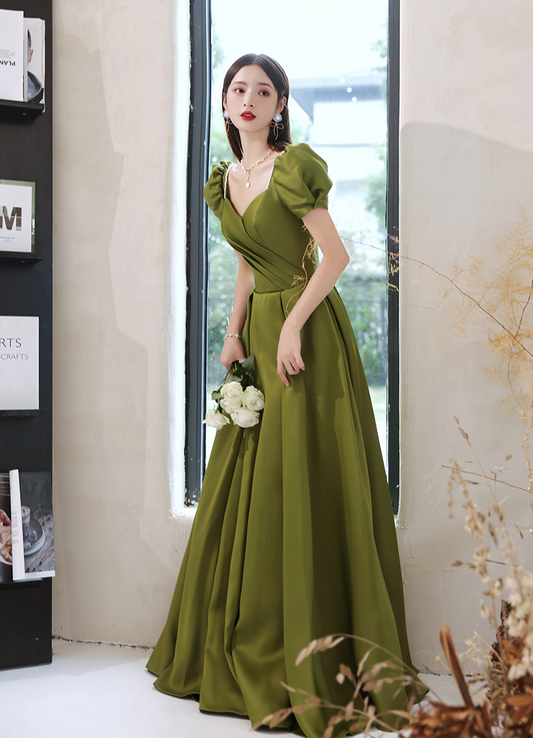 Grünes kurzärmliges Satin-Abschlussballkleid in A-Linie, Abendpartykleid 1702