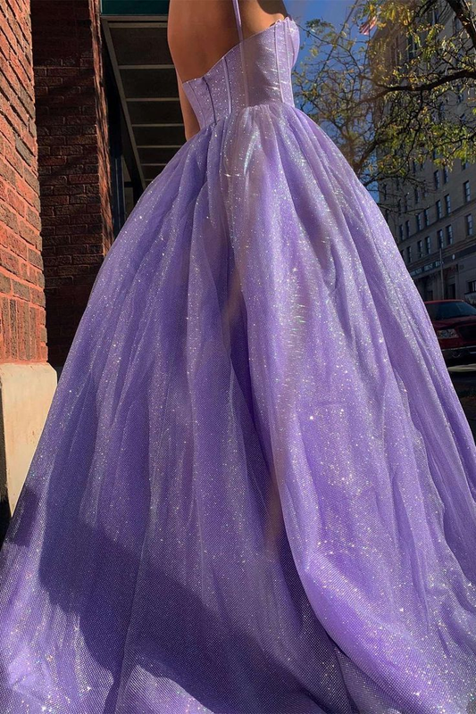 Helllila langes Ballkleid mit Spaghettiträgern, glitzerndes Seniorenkleid in A-Linie 2129