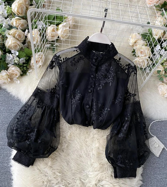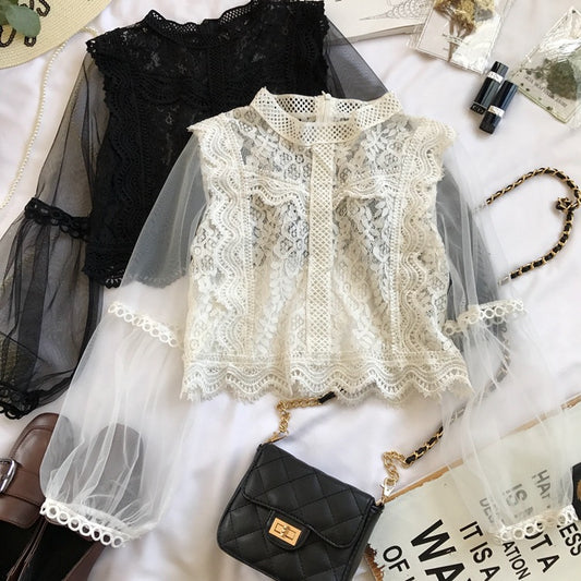 Frauen-Spitze gekürzte lange Hülsen-Spitze Elegante Spitze-Blumen-Stickerei-Bluse 12