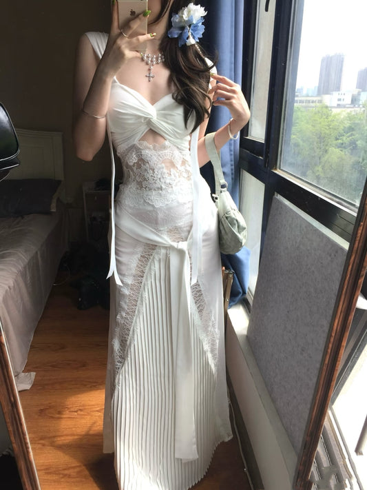 Weißes A-Linien-Plissee-Abendkleid mit Spitze J6651