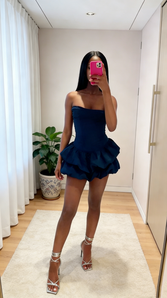 Trägerloses A-Linien-Heimkehrkleid in Blau, kurzes Partykleid J8447