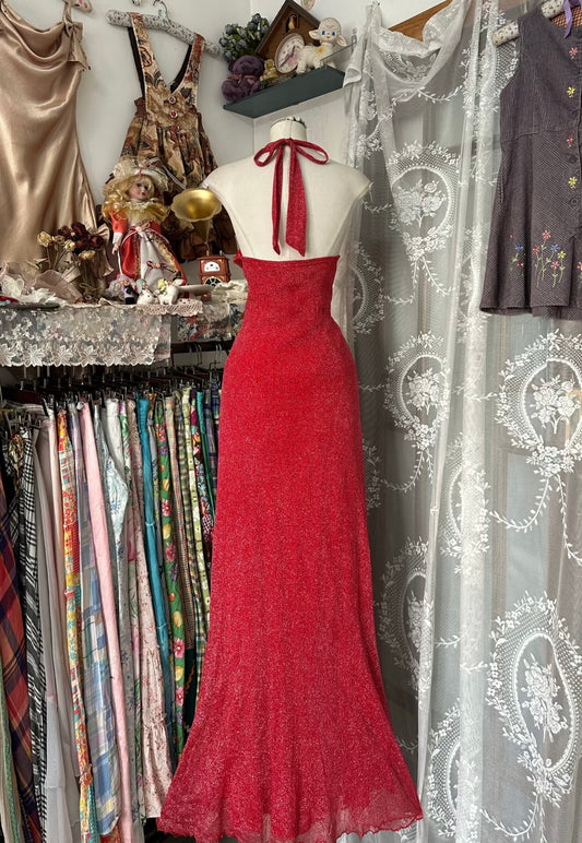 Neckholder Meerjungfrau Rot Vintage Kleid Rüschen Formales Ballkleid J6610