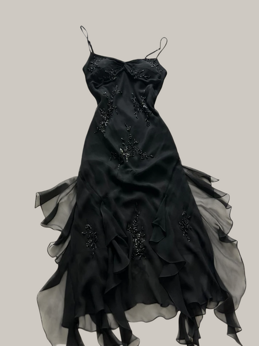 Perlenbesetztes A-Linien-Ballkleid in Schwarz, Vintage, formelles Abendkleid J8696