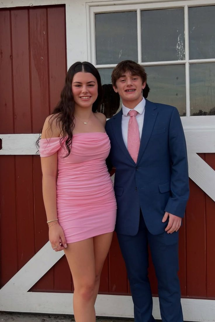 Schulterfreies, rosa, gerüschtes Etuikleid J7282